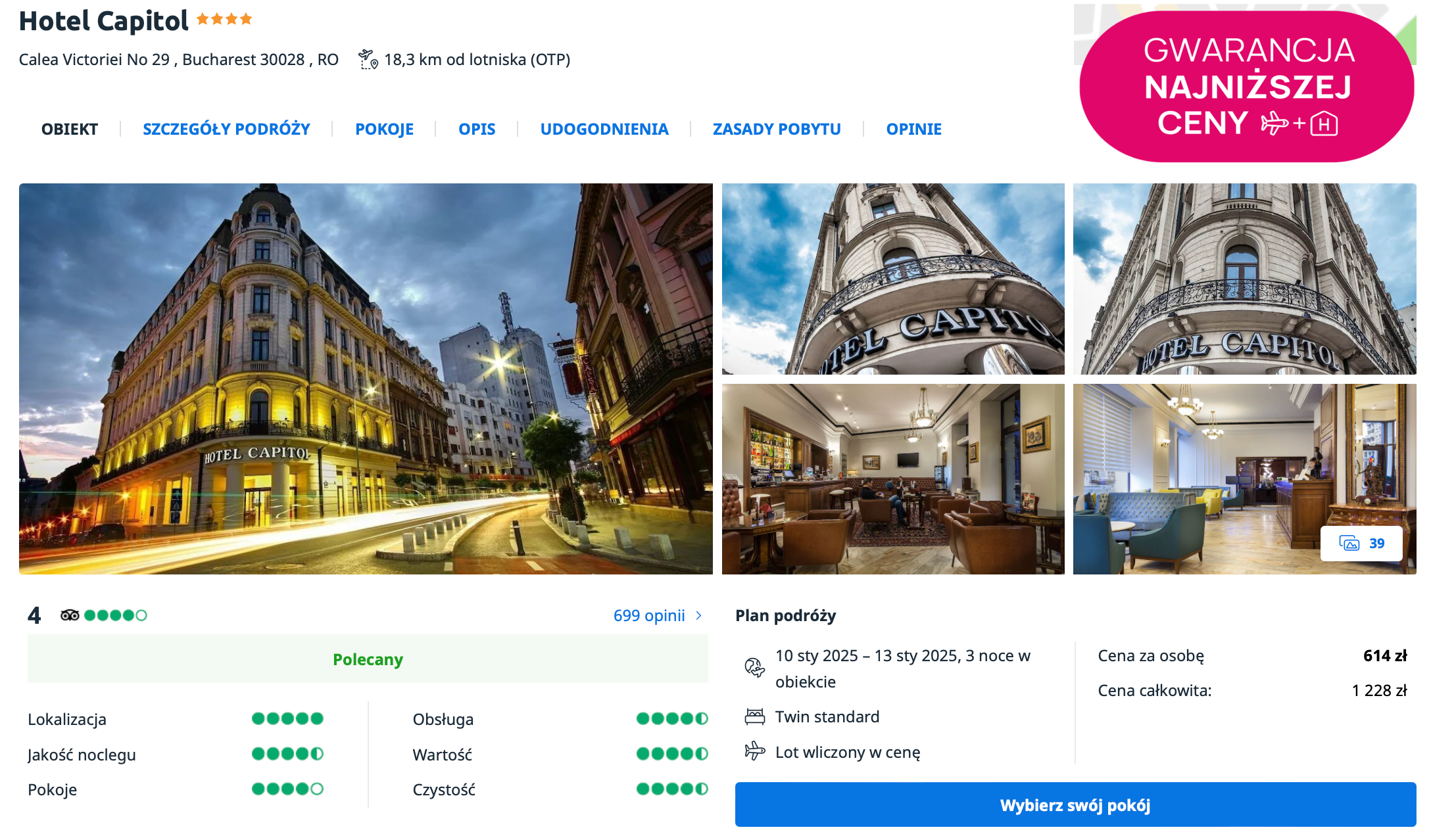 W Bukareszcie zatrzymasz się w 4* hotelu Capitol, który położony jest w samym sercu stolicy, blisko najważniejszych atrakcji miasta. Do twojej dyspozycji będzie komfortowy pokój wyposażony m.in. w minibar i ekspres do kawy.