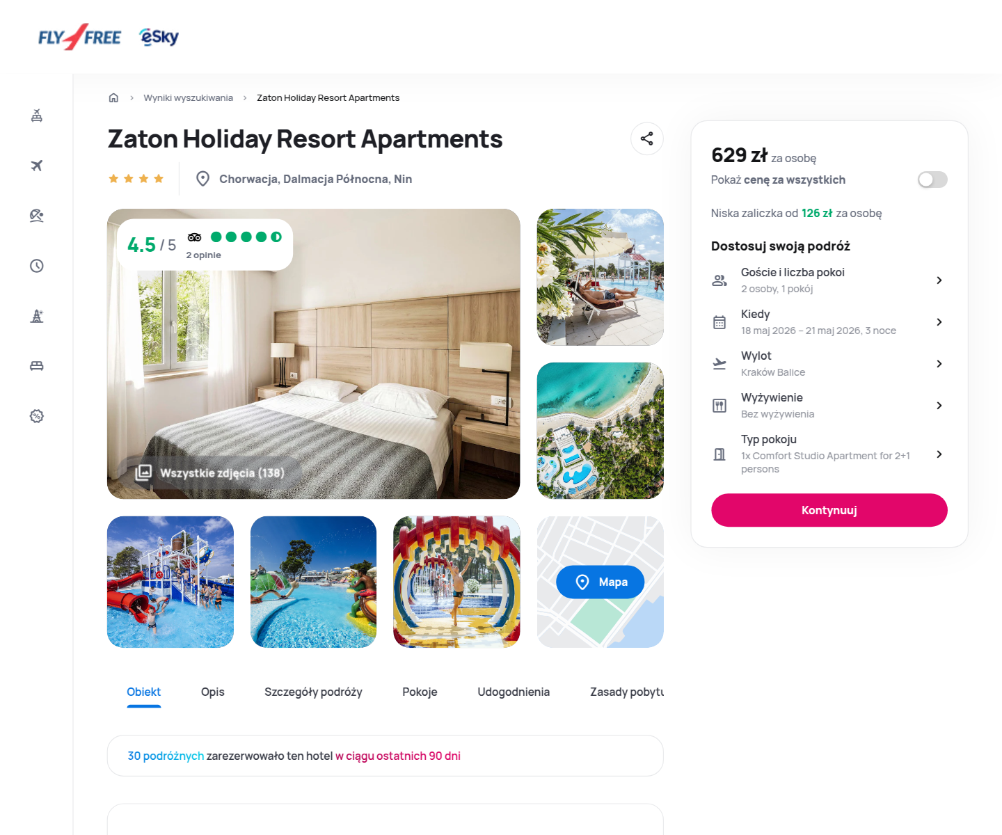 Na miejscu czeka 4* Zaton Holiday Resort Apartments w Nin, położony 5 minut spacerem od piaszczystej plaży Zaton. Resort dysponuje aż dziewięcioma basenami, strefą spa z zabiegami i masażami oraz licznymi barami i restauracjami serwującymi kuchnię śródziemnomorską. Okolica kusi zabytkami – w pobliżu znajdują się romański Kościół św. Mikołaja oraz Kamienny Most, a miłośnicy przyrody mogą wybrać się na wycieczki do Jezior Plitwickich lub archipelagu Kornati.