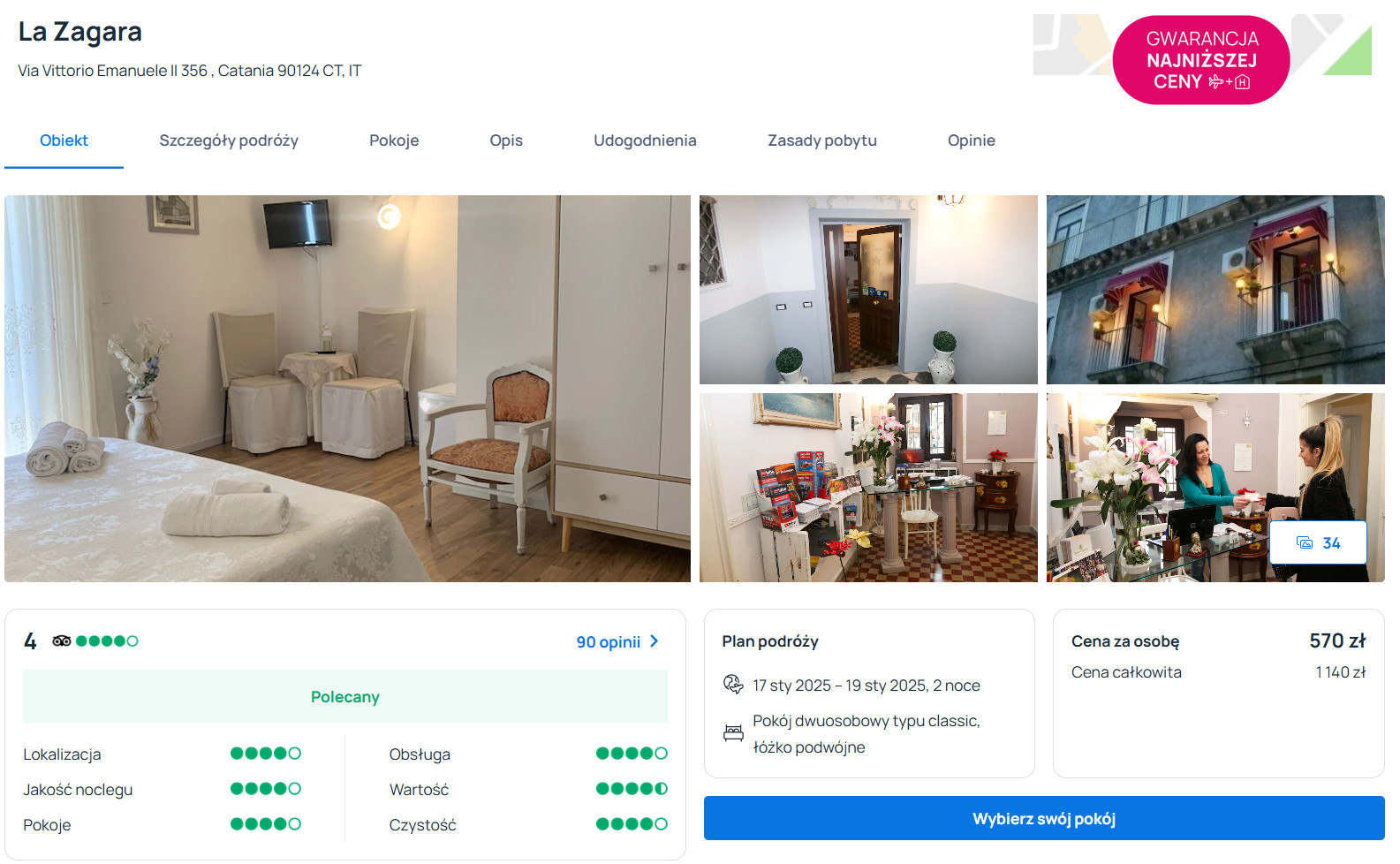 Na Sycylii zatrzymasz się w fantastycznym pensjonacie La Zagara B&B, który od ścisłego centrum Katanii oddalony jest o 800 metrów. Każdy pokój jest ogrzewany i wyposażony w telewizor LCD, lodówkę oraz czajnik elektryczny. W łazience jest prysznic oraz podstawowe przybory toaletowe. W cenie zapewnione będziesz miał codzienne śniadania oraz dostęp do sieci WiFi.