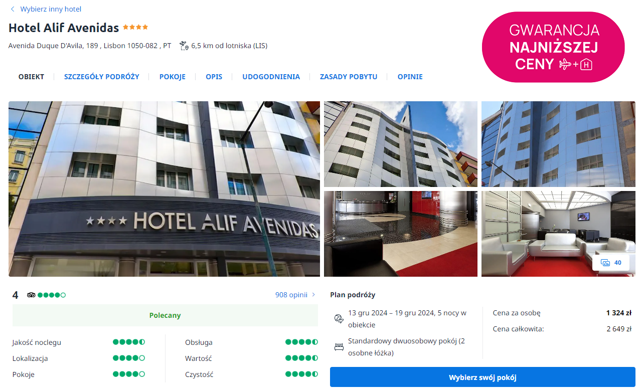 Będziesz zakwaterowany w 4* hotelu Alif Avenidas. Obiekt oferuje nowocześnie urządzone wnętrza, przestronne pokoje oraz dogodną lokalizację. Będzie on bardzo dobra bazą wypadową w czasie krótkie wycieczki do portugalskiej stolicy.