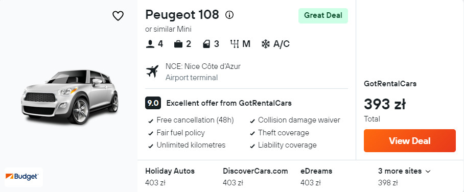 We Francji zatrzymasz się w hotelu Ibis Budget Nice Californie Lenval, który znajduje się tuż przy Promenadzie Anglików. Z lotniska w okolice miejsca noclegowego (przystanek Lenval Hôpital) dojedziesz tramwajem linii L2 lub wypożyczonym samochodem – szczegóły poniżej.