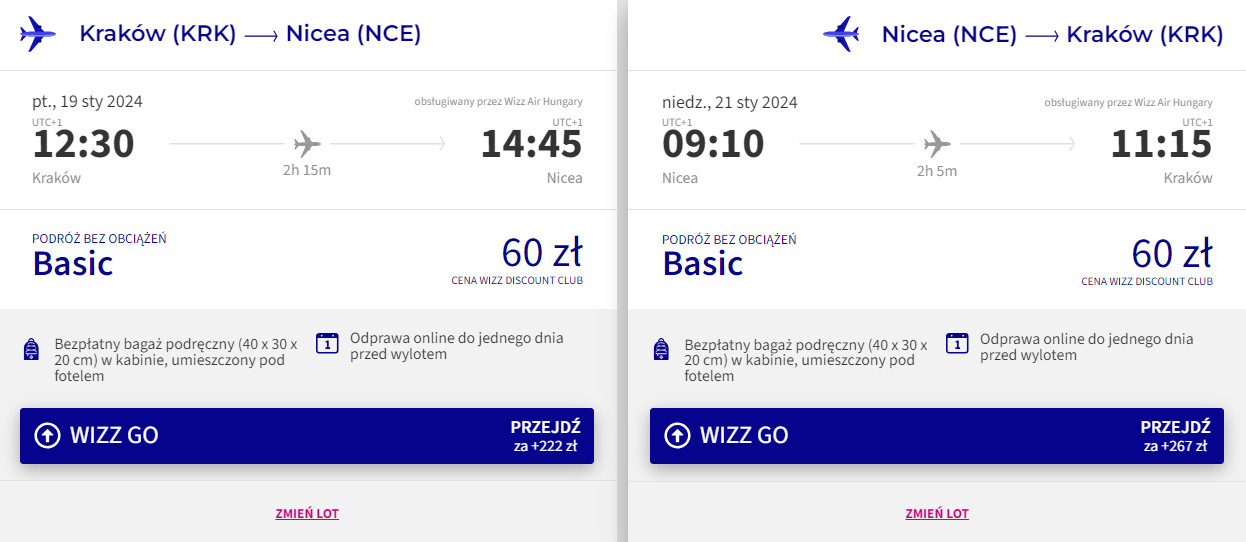 Do Nicei udasz się z krakowskiego lotniska w Balicach w terminie 19-21 stycznia (piątek-niedziela). W obie strony polecisz na pokładzie samolotu linii Wizz Air z wliczonym małym bagażem podręcznym. Bilety w najniższej cenie dostępne są dla członków Wizz Discount Club. Chętni na loty bez WDC zapłacą więcej.