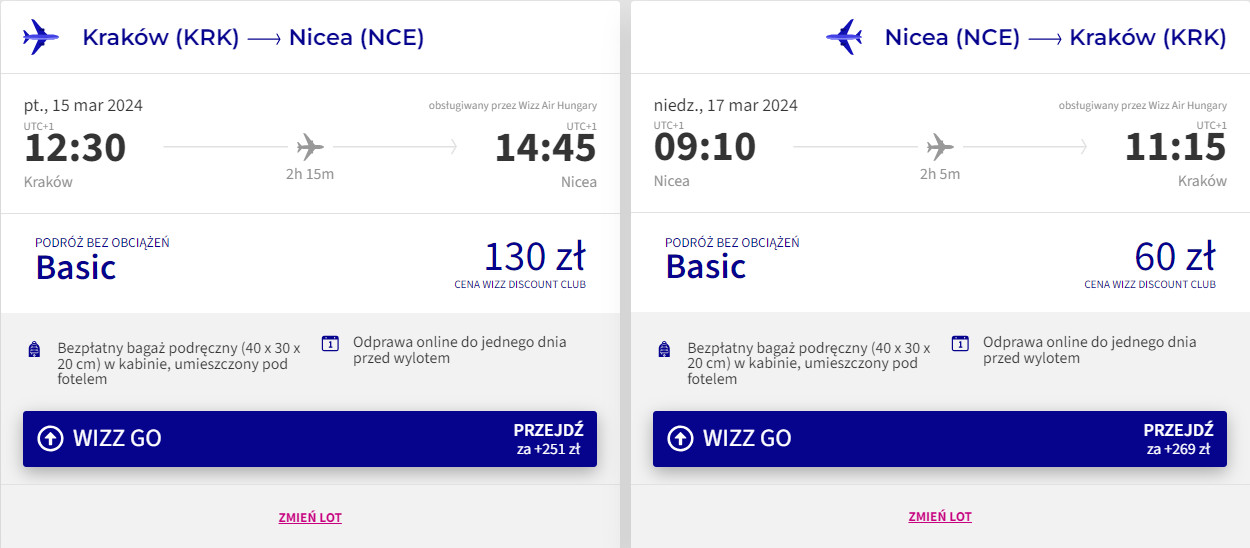 Do Nicei udasz się z portu lotniczego Kraków-Balice w terminie 15-17 marca (piątek-niedziela). W obie strony polecisz na pokładzie samolotu linii Wizz Air z wliczonym małym bagażem podręcznym. Bilety w najniższej cenie dostępne są dla członków Wizz Discount Club. Chętni na loty bez WDC zapłacą więcej.