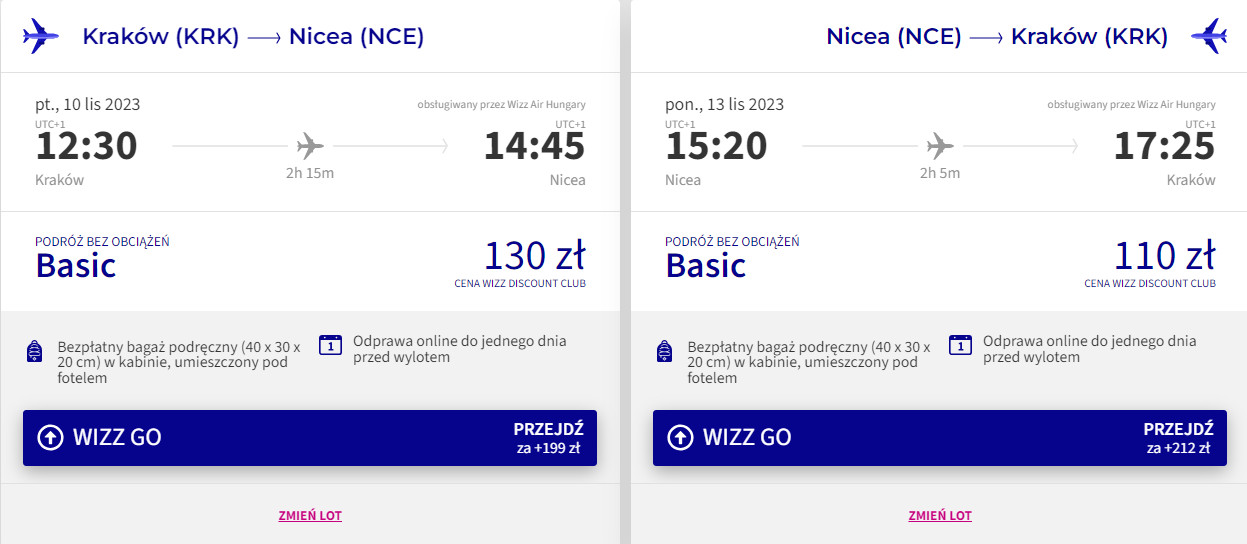 Do Nicei udasz się z lotniska Kraków-Balice w terminie 10-13 listopada (piątek-poniedziałek). W obie strony polecisz na pokładzie samolotu linii Wizz Air z wliczonym małym bagażem podręcznym. Bilety w najniższej cenie dostępne są dla członków Wizz Discount Club. Chętni na loty bez WDC zapłacą więcej.