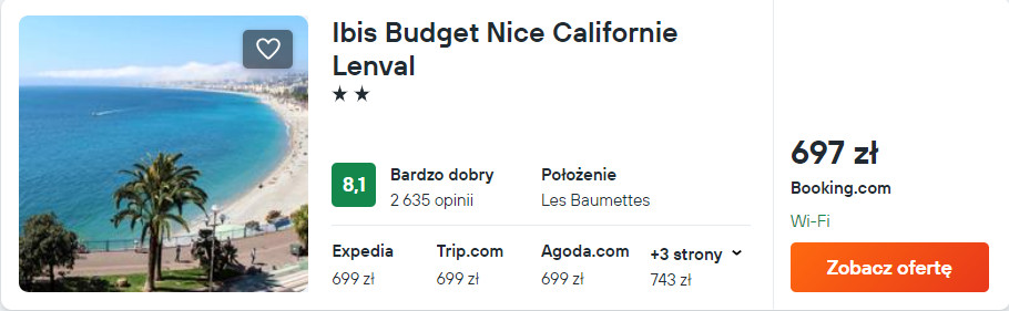 We Francji zatrzymasz się w hotelu Ibis Budget Nice Californie Lenval, który znajduje się tuż przy Promenadzie Anglików. Z lotniska w okolice miejsca noclegowego (przystanek Lenval Hôpital) dojedziesz tramwajem linii L2 za 1.5 EUR lub wypożyczonym samochodem – szczegóły poniżej.
