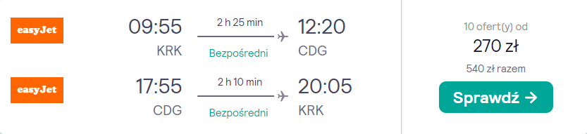 Do Paryża udasz się z krakowskiego lotniska w piątek (24 lutego) o godzinie 9:55 rano. W drogę powrotną do Polski wyruszysz w niedzielę (26 lutego) o godzinie 17:55. W obie strony polecisz na pokładach samolotów linii easyJet z wliczonym małym bagażem podręcznym.