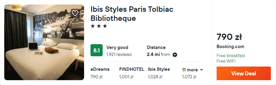 W stolicy Francji zatrzymasz się w 3* hotelu Ibis Styles Paris Tolbiac Bibliotheque, który znajduje się w sąsiedztwie menażerii Jardin des Plantes. Z lotniska (Charles de Gaulle) w okolice miejsca noclegowego (przystanek Bibliothèque François Mitterrand) dojedziesz komunikacją publiczną. W tym wątku na forum znajdziesz szczegółowe informacje, jak dostać się z portu lotniczego do centrum Paryża.