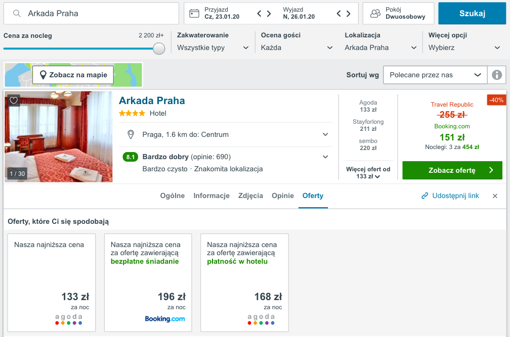 Do Pragi wybierzecie się 23-26 stycznia linią Ryanair. Bilety w dwie strony będą was kosztowały jedynie 78 PLN za osobę. Dzięki naszym poradom podróż z małym bagażem podręcznym nie powinna stanowić problemu. Za noclegi w 4* hotelu zapłacicie 390 PLN (195 PLN za osobę). Obiekt posiada dobre opinie wystawione przez dotychczasowych gości.