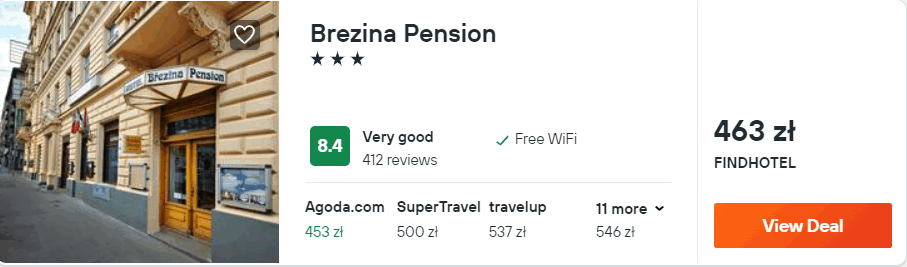 W stolicy Czech zakwaterowani będziecie w 3* hotelu Brezina Pension, który znajduje się w centrum miasta. Z lotniska w okolice miejsca noclegowego (przystanek Náměstí Míru) dojedziecie autobusem nr 191 oraz metrem (linia A).