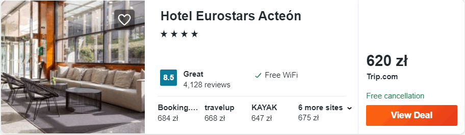 Zakwaterowani będziecie w 4* hotelu Eurostars Acteón, który znajduje się nieopodal kompleksu Ciudad de las Artes y las Ciencias. Z lotniska w okolice proponowanego miejsca noclegowego (przystanek Ayora) dojedziecie tramwajem nr 5 za 1,04 EUR (ok. 5 PLN).