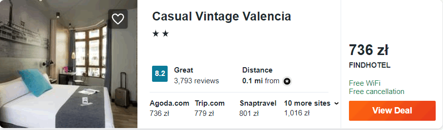 W Walencji rekomenduję wam noclegi w hotelu Casual Vintage, w którym zakwaterowani będziecie w dwuosobowym pokoju wyposażonym w klimatyzację, telewizor LCD oraz ogrzewanie. W łazience jest wanna z prysznicem oraz bezpłatny zestaw kosmetyków.