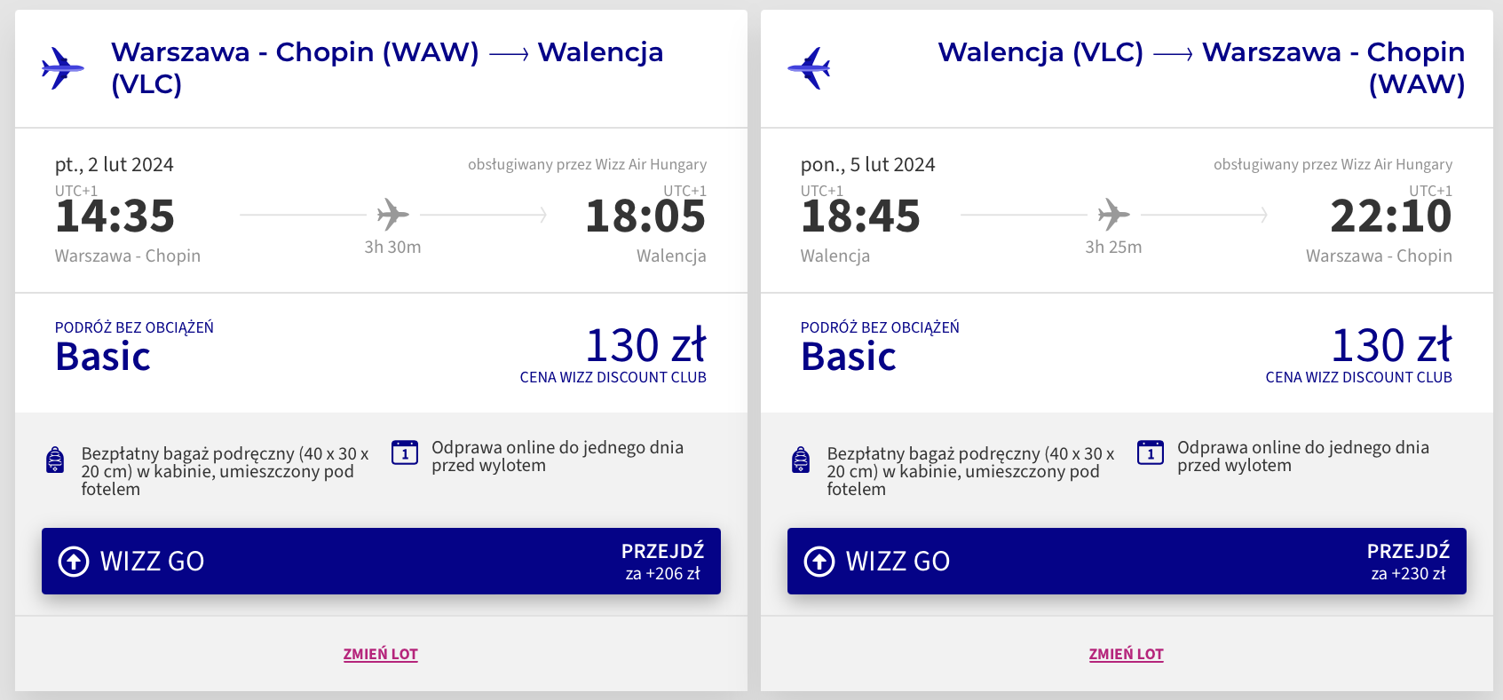 Do Hiszpanii udasz się z Warszawy w terminie 2-5 lutego stycznia (piątek-poniedziałek). W obie strony polecisz na pokładzie samolotu linii Wizz Air z wliczonym małym bagażem podręcznym. Bilety w najniższej cenie dostępne są dla członków Wizz Discount Club. Chętni na loty bez WDC zapłacą więcej.