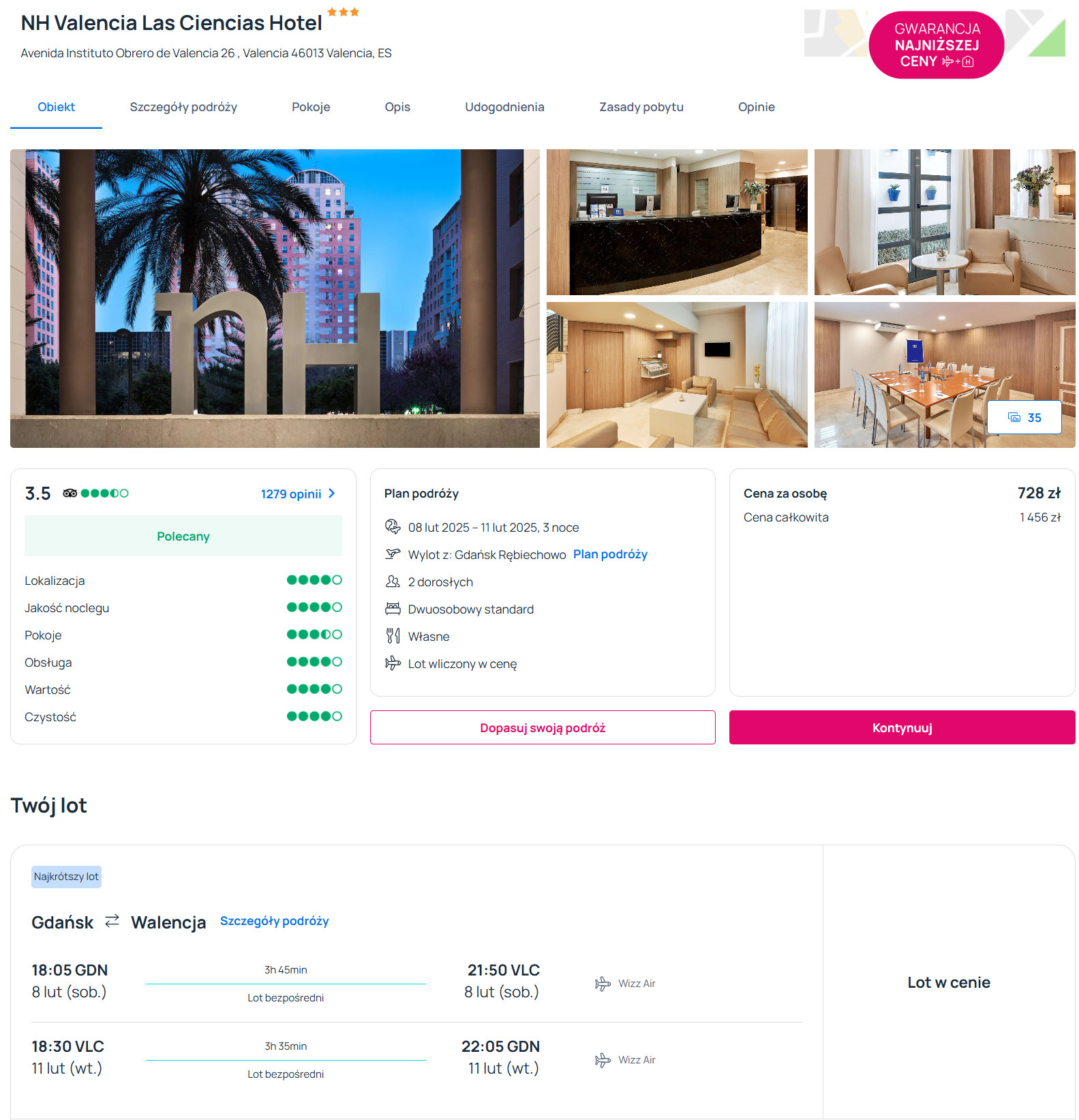 W Walencji zatrzymasz się w 3* hotelu NH Valencia Las Ciencias, który położony jest obok Miasta Sztuki i Nauki. Każdy pokój jest ogrzewany i wyposażony w telewizor LCD, lodówkę oraz czajnik elektryczny. W łazience jest prysznic, suszarka do włosów oraz podstawowe przybory toaletowe. Na terenie całego obiektu będziesz miał zapewniony dostęp do sieci WiFi.