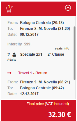 Przejazd z Bolonii do Florencji i z powrotem zarezerwujecie za 33.20 EUR czyli ok. 138 PLN/2 osoby na treitalia.com
