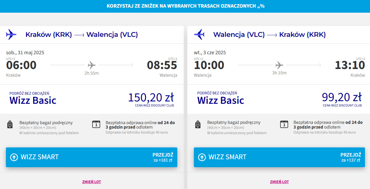 Do Walencji polecisz z Krakowa linią Wizz Air. Pamiętaj, że bilety w najniższej cenie dostępne są dla członków Wizz Discount Club. Chętni na loty bez WDC zapłacą nieco więcej – szczegóły poniżej.