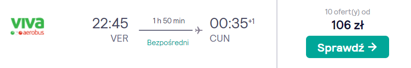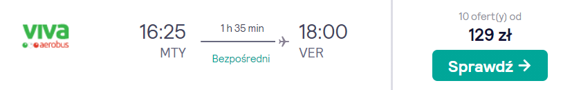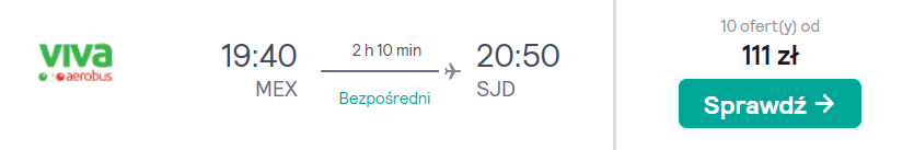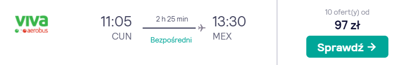 Uzupełnieniem oferty są loty krajowe pomiędzy meksykańskimi miasta. Wszystkie zebrane i przedstawione przeze mnie połączenia są bezpośrednie, a pokonacie je na pokładzie samolotu linii VivaAerobus. Zwracam uwagę, że w cenie najtańszych biletów (na lotach krajowych) zabrać ze sobą będziecie mogli tylko mały bagaż podręczny – za możliwość zabrania na pokład małej walizki + przedmiotu osobistego będziecie musieli dodatkowo zapłacić.