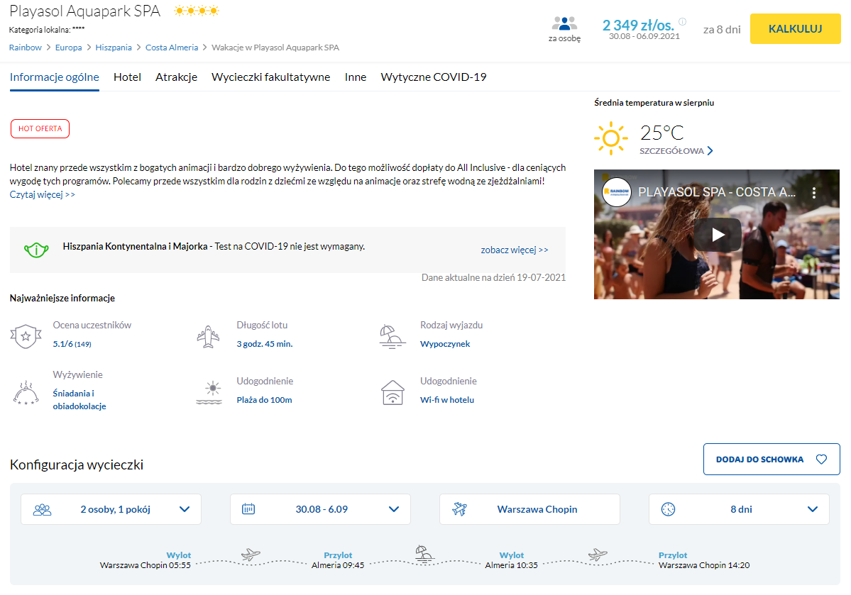 A może by tak… przedłużyć sobie wakacje? Niech ten cudowny czas nigdy się nie kończy! Wybierzcie się wraz z biurem podróży Rainbow na 8-dniowy wypoczynek do przepięknej Andaluzji, a dokładniej na wybrzeże Costa Almeria. 4* hotel, w którym się zatrzymacie, znany jest z doskonałej kuchni oraz świetnych animacji, w których mogą uczestniczyć goście obiektu. Ktoś chętny na ostatnie promyki wakacyjnego słońca 😉?