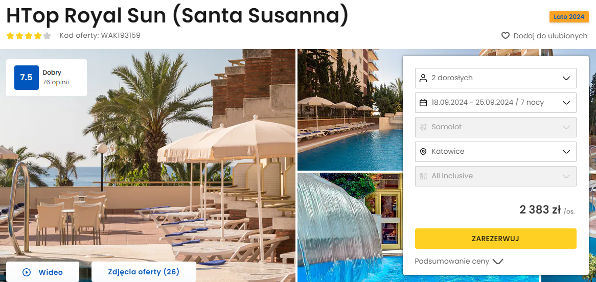Urlop spędzisz w 4* hotelu HTop Royal Star, który znajduje się w spokojnej okolicy, przy piaszczysto-żwirowej plaży. Na terenie obiektu znajdują się 2 baseny, strefa saun oraz jacuzzi. W cenie otrzymasz przeloty, transfery z lotniska do hotelu, wyżywienie w formule all inclusive oraz podstawowe ubezpieczenie.
