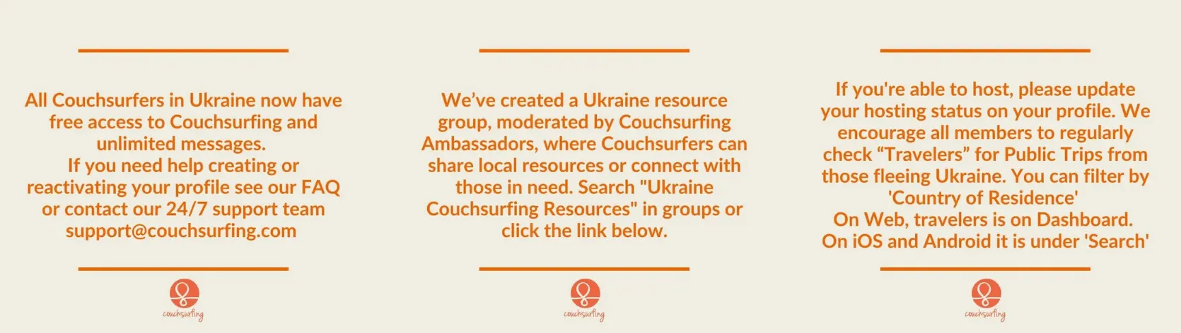 Przede wszystkim, przypomnieli o opcji „public trip”. Poszukiwanie w takiej wersji sprawia, że wszyscy aktywni gospodarze dostaną powiadomienia o takiej poszukującej osobie. Platforma zniosła też wszystkie opłaty za rejestrację i korzystanie z Couchsurfingu dla użytkowników z Ukrainy. Nie ma też limitu wiadomości.