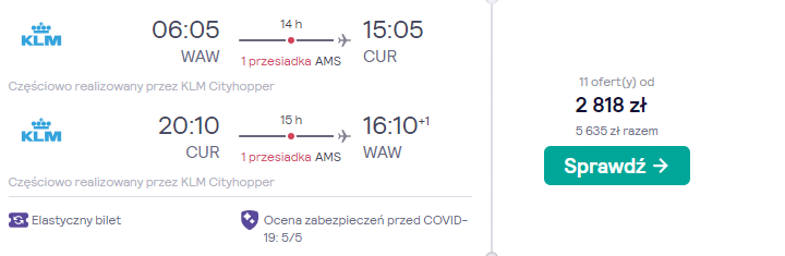 Na Karaiby polecicie dopiero w przyszłym roku – w trakcie trwania ferii zimowych w woj. mazowieckim: 5 – 12 lutego. Czeka was podróż z warszawskiego lotniska im. Fryderyka Chopina, realizowana na pokładzie samolotów linii lotniczej KLM. Po drodze zaplanowano bezpieczne, gwarantowane przez przewoźnika przesiadki w Amsterdamie.