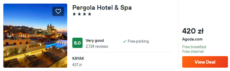 Na Malcie rekomenduję ci noclegi w 4* hotelu Pergola & Spa z krytym basenem. Każdy pokój wyposażony jest w klimatyzację z funkcją ogrzewania, telewizor LCD oraz minibar. W łazience jest prysznic, suszarka do włosów oraz podstawowe przybory toaletowe. We wszystkich pomieszczeniach będziesz mieć zapewniony dostęp do sieci WiFi.