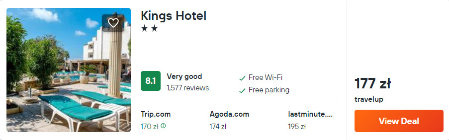 W Pafos proponuję ci noclegi w hotelu King’s. Każdy pokój wyposażony został w klimatyzację, telewizor LCD oraz lodówkę. W łazience jest prysznic i suszarka do włosów. Na terenie całego obiektu będziesz mieć zapewniony dostęp do sieci WiFi oraz bezpłatnego parkingu.