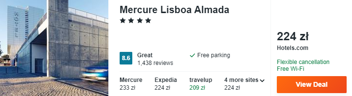 Dowiedzcie się więcej o tym hoteluW Lizbonie wybrałem dla was noclegi w 4* hotelu znanej sieci Mercure za 224 PLN/pokój.