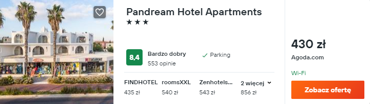 Wybrałem dla was noclegi w bardzo dobrze ocenianym 3* Pandream Hotel Apartments. To komfortowy obiekt położony niedaleko plaży – będzie to świetna baza wypadowa dla waszych wycieczek po okolicy.
