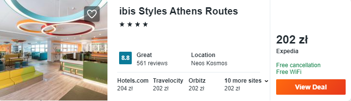 W Atenach polecam wam zatrzymać się w 4* hotelu ibis Styles Athens Routes. Obiekt jest świetnie zlokalizowany – od większości atrakcji miasta będzie was dzielić kilkaset metrów. Na miejscu natomiast znajdziecie wszystko, czego potrzeba w trakcie krótkiego city breaku – darmowe Wi-Fi, pokoje z TV i prywatną łazienką oraz restaurację z barem.