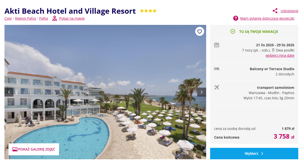 Na Cypr polecisz w terminie 21 – 28 listopada z Warszawy (Modlin). Czeka cię podróż z Ryanair, a w cenie możesz zabrać bagaż podręczny.