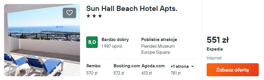 W Larnace zatrzymasz się w 3* kompleksie Sun Hall Beach Hotel Apartments, który znajduje się w sąsiedztwie mariny oraz plaży Finikoudes. Z lotniska w okolice miejsca zakwaterowania dojedziesz autobusem nr 432 lub wypożyczonym samochodem – szczegóły poniżej.