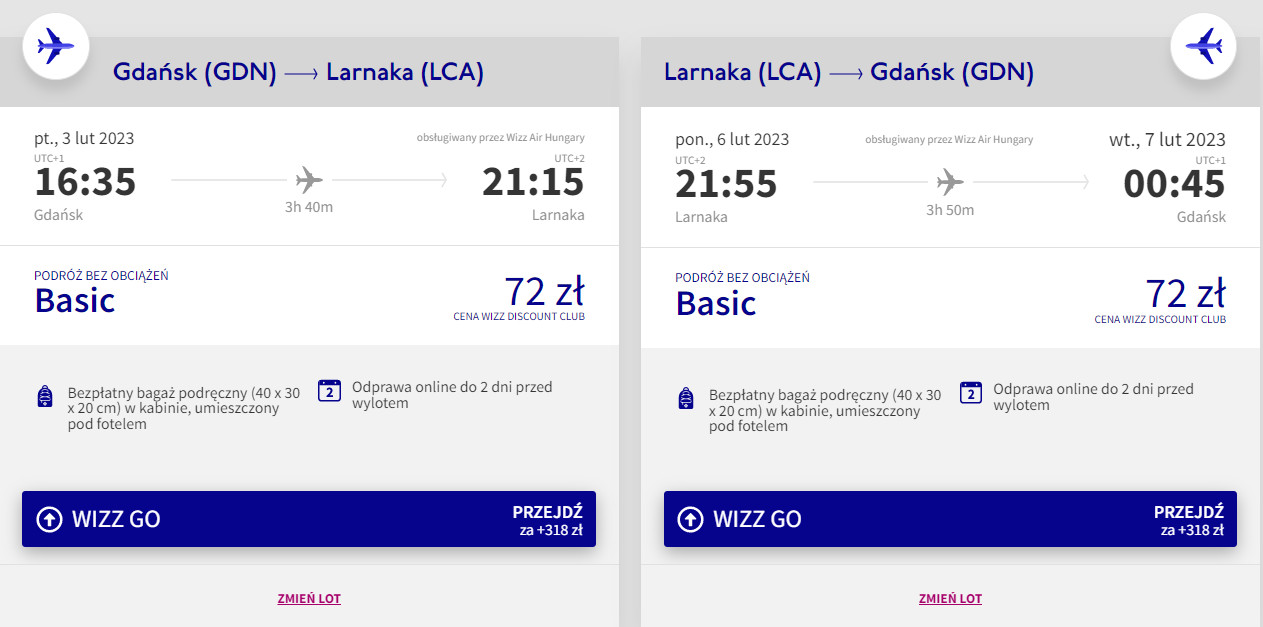 Do Larnaki udasz się z gdańskiego portu lotniczego im. Lecha Wałęsy w terminie 3 – 6 lutego (piątek-poniedziałek) przyszłego roku. W obie strony polecisz na pokładzie samolotów linii Wizz Air z wliczonym małym bagażem podręcznym. Bilety w najniższej cenie dostępne są dla osób z Wizz Discount Club. Chętni na loty bez WDC zapłacą więcej.