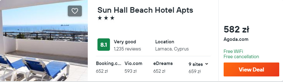 Na Cyprze zatrzymasz się w 3* hotelu apartamentowym Sun Hall Beach, który znajduje się w sąsiedztwie plaży Finikoudes w Larnace. Z lotniska w okolice miejsca noclegowego dojedziesz autobusem lub wypożyczonym samochodem — szczegóły poniżej.