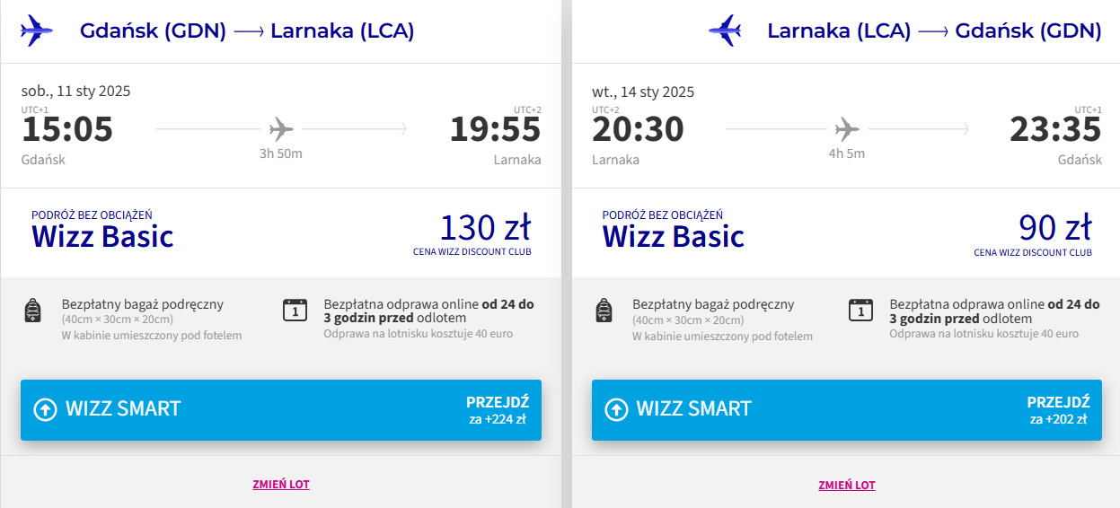 Do Larnaki udasz się z Gdańska w sobotę (11 stycznia) o godzinie 15:05. W drogę powrotną do Polski wyruszysz we wtorek (14 stycznia), a wylot zaplanowano na godzinę 20:30. W obie strony podróżować będziesz bezpośrednio linią Wizz Air z bagażem podręcznym. Bilety w najniższej cenie dostępne są dla członków Wizz Discount Club. Chętni na loty bez WDC zapłacą więcej.