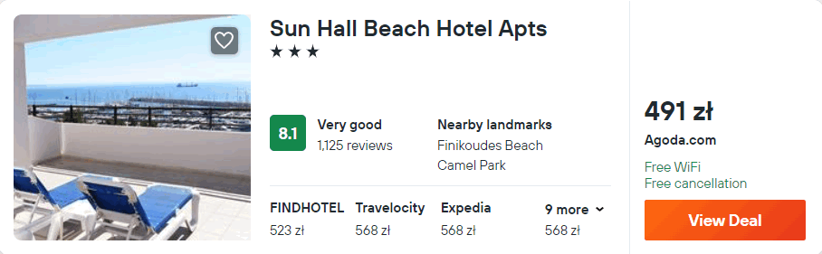 W Larnace zakwaterowani będziecie w 3* hotelu apartamentowym Sun Hall Beach, który znajduje się przy plaży Finikoudes. Z lotniska w okolice miejsca noclegowego dojedziecie autobusem lub wypożyczonym samochodem – szczegóły poniżej.