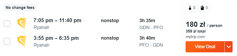 Na wycieczkę wybierzecie się w wakacyjnym terminie 14 – 21 lipca. Podróż rozpoczniecie i zakończycie na gdańskim lotnisku, a do Pafos udacie się na pokładzie samolotu linii lotniczej Ryanair. Bez dodatkowych kosztów zabierzecie ze sobą bagaż podręczny. Przed podróżą przeczytajcie nasz poradnik, jak się spakować.