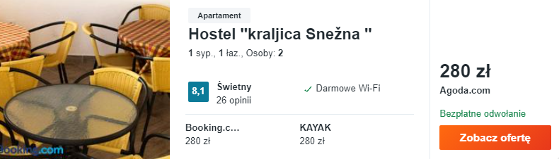 Wybrałem dla was noclegi w bardzo dobrze ocenianym hostelu kraljica Snežna – niech jednak nie zwiedzie was jego nazwa. Na miejscu zakwaterowani będziecie w komfortowym apartamencie z prywatną łazienką, a najbliższa plaża znajduje się w odległości krótkiego spaceru od obiektu. Z lotniska w Podgoricy do Sutomore, gdzie znajduje się wybrane przeze mnie miejsce zakwaterowania dojedziecie bez problemu pociągiem.