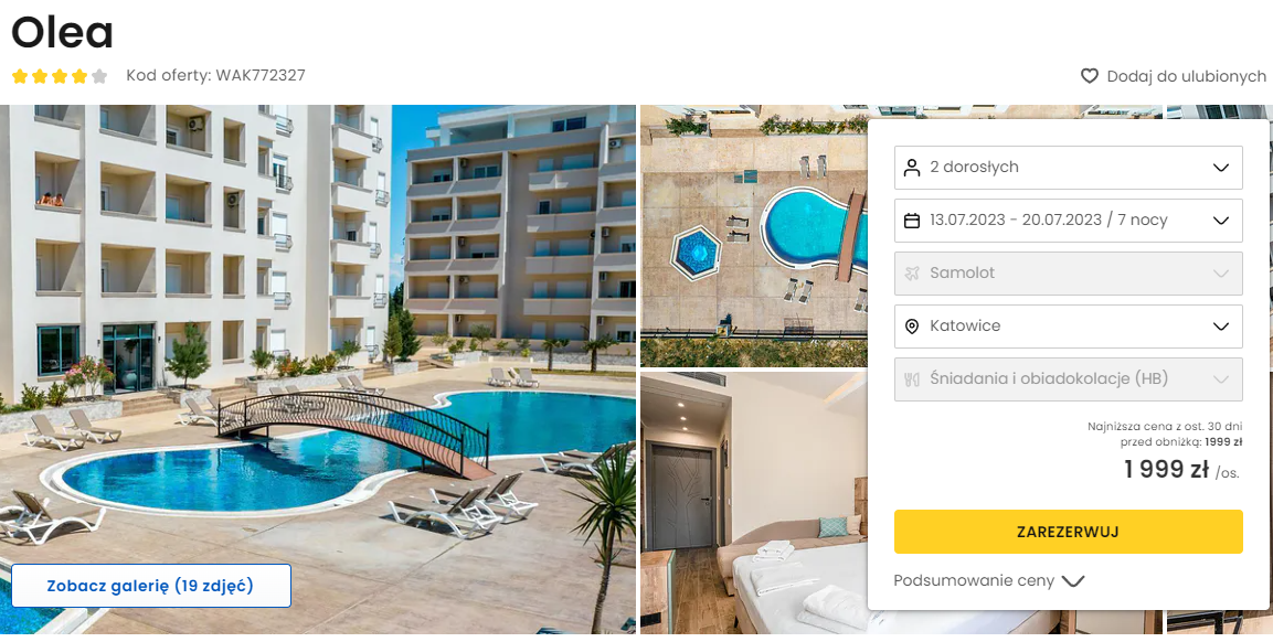 Spędzisz tydzień w 4* hotelu Olea. Dla gości przygotowano tam m.in. odkryty basen, pokoje z balkonem i klimatyzacją oraz darmowe transfery na plażę. W cenie wycieczki otrzymasz przeloty, transport na trasie lotnisko – hotel – lotnisko, opiekę rezydenta, podstawowe ubezpieczenie oraz wyżywienie w formie śniadań i obiadokolacji.