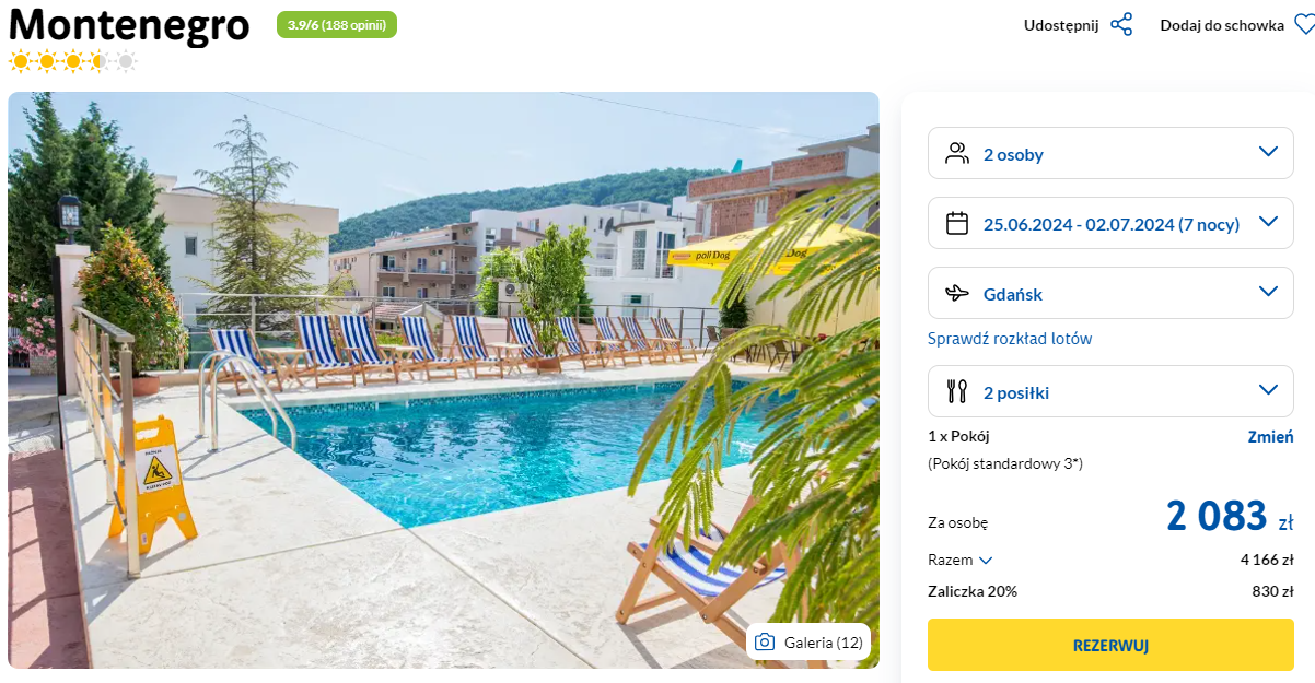 Do Czarnogóry udasz się w terminie 25 czerwca – 2 lipca. Czeka cię bezpośredni lot z Gdańska do Podgoricy, realizowany na pokładzie samolotu linii lotniczej Enter Air. W cenę pakietu wliczono podróż z bagażem rejestrowanym.