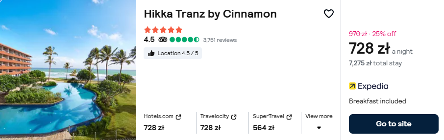 Natomiast na wybrzeżu postaw na noclegi w 5* hotelu Hikka Tranz by Cinnamon, z odkrytym basenem. Znajduje się on tuż przy plaży.