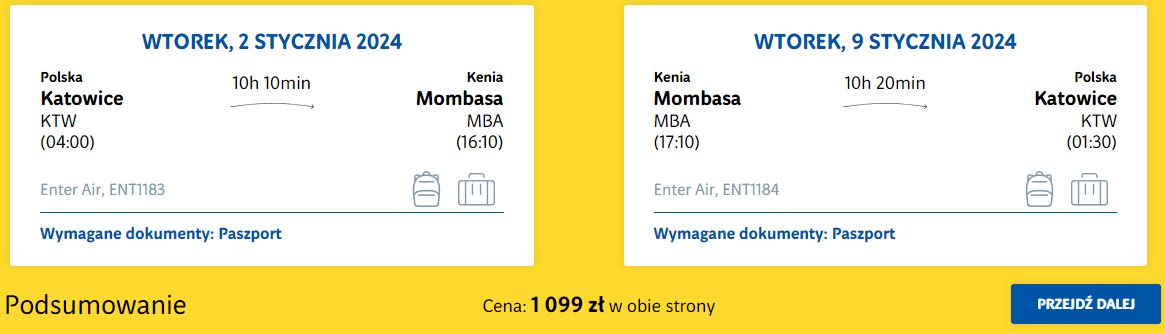 Do Mombasy podróżować będziesz z Katowic w terminie 2-9 stycznia lub z Wrocławia w terminie 3-10 stycznia. W obie strony polecisz na pokładzie samolotu linii lotniczej Enter Air. W cenę wliczono bagaż rejestrowany (nadawany do luku) oraz podręczny.
