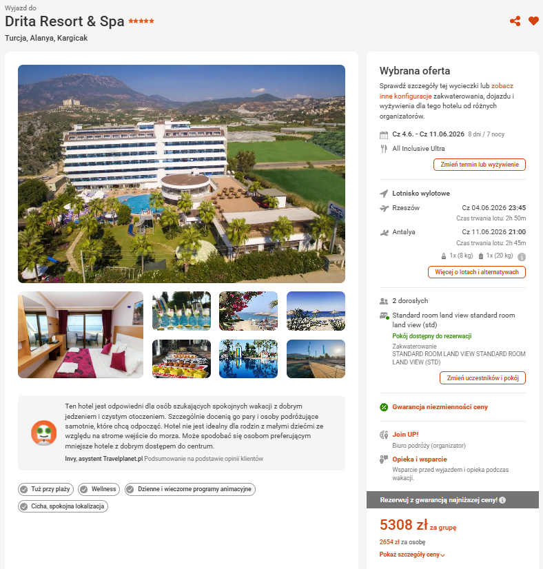 Będziesz zakwaterowany w 5* hotelu Drita Resort & Spa. Goście chwalą bliskość plaży – zaledwie 40 metrów, do której prowadzi wygodny tunel. W opiniach podkreślają różnorodność dań w restauracji, czystość pokoi oraz profesjonalną obsługę. Ośrodek dysponuje basenem zewnętrznym i krytym, centrum wellness z turecką łaźnią i sauną, a także mini klubem dla dzieci. Wieczorami czekają występy artystyczne i programy rozrywkowe.