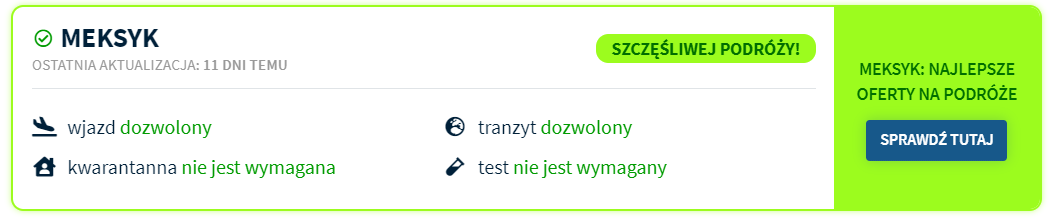 Raz w życiu na taki luksus można sobie pozwolić. Skorzystajcie z oferty i cieszcie się z ekskluzywnego wypoczynku nad meksykańskim wybrzeżem Morza Karaibskiego – bez testów i kwarantanny! Do Cancun polecicie w klasie biznes, a na miejscu zakwaterowani będziecie w fantastycznym 4* hotelu. Taki pakiet urlopowy dostępny jest za nieco ponad 4900 PLN.