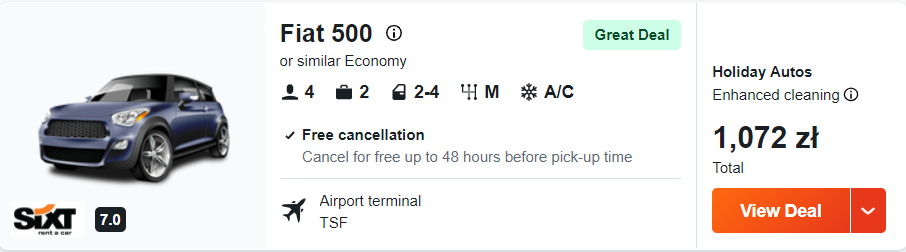 Do tanich lotów do Wenecji rekomenduję wam także wypożyczyć samochód na cały pobyt we Włoszech. Więcej informacji związanych z wynajmem oraz plan podróży znajdziecie poniżej w tekście.