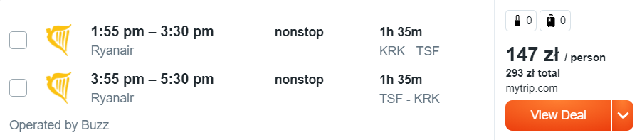 Na wycieczkę do Włoch udacie się na początku kalendarzowego lata, w terminie obejmującym pierwszy weekend wakacji (23-30 czerwca). Z krakowskiego lotniska w Balicach na pokładzie samolotu linii Ryanair podróżować będziecie do Wenecji (port lotniczy Treviso). W cenie biletu zabrać ze sobą będziecie mogli mały bagaż podręczny – za bagaż nadawany do luku będziecie musieli dodatkowo zapłacić 99 PLN w jedną stronę.