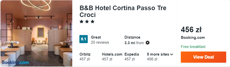 Po przylocie do Wenecji ruszcie od razu do Cortina d’Ampezzo, gdzie rekomenduję wam spędzić 3 noce. Na miejscu polecam wam noclegi z codziennymi śniadaniami w 3* hotelu Cortina Passo Tre Croci, który znajduje się nieopodal wejścia na szlak prowadzącego nad jezioro Sorapis.