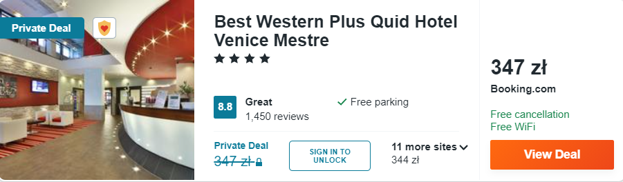 Dowiedzcie się więcej o tym hoteluNoc poprzedzając podróż powrotną do kraju, rekomenduję wam spędzić w sąsiedztwie Wenecji. W miejscowości Mestre zatrzymajcie się w 4* hotelu Best Western Plus Quid.