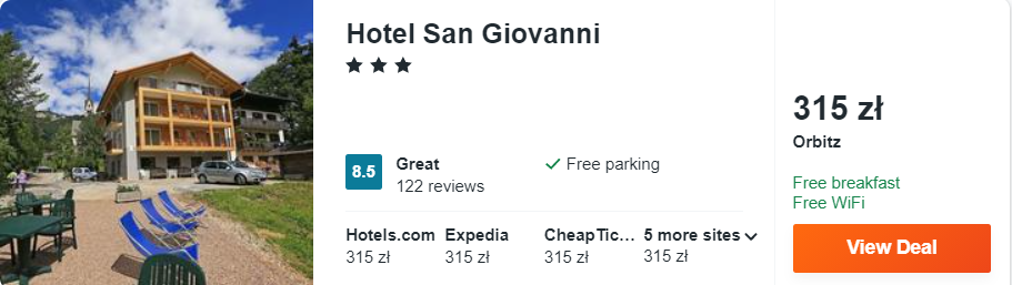 Dowiedzcie się więcej o tym hoteluNastępnie przenieście się na kolejne 3 noce do miejscowości Vigo di Fassa, gdzie polecam wam noclegi ze siadaniami w 3* hotelu San Giovanni.