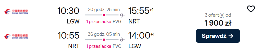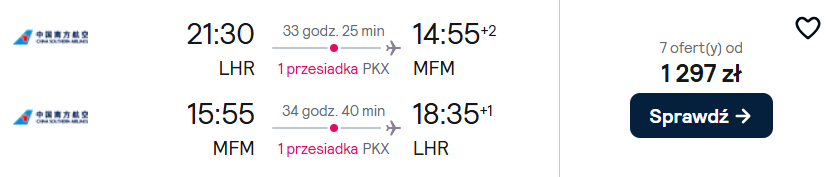 Do Hongkongu, Japonii (Osaka, Tokio), Korei Południowej (Seul), oraz na Tajwan (Tajpej) polecisz linią China Eastern z przesiadkami Szanghaju. Natomiast do Makau dostaniesz się linią China Southern z przesiadkami w Pekinie.