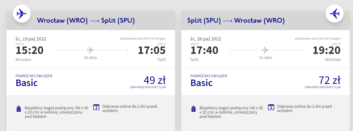Podróż do Chorwacji zaplanowana została w terminie 19 – 26 października. Czeka was bezpośredni lot do Splitu z Wrocławia, realizowany na pokładzie samolotu linii lotniczej Wizz Air. Najtańsze bilety zakupią posiadacze Wizz Discount Club, pozostałe osoby zapłacą nieco więcej.